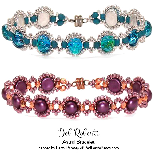 ASTRAL BRACELET (©2019 Deborah Roberti) Originally created for the gorgeous new Czech 8x6mm Baroque oval two-hole cabochons, this design also works perfectly with 7mm Baroque round two-hole cabochons and 7mm round Czechmates two-hole cabochons. The stitch is very easy—basically a modified right-angle weave—and along with the two-hole cabochons, all you need are some size 11 seed beads and 3mm fire-polished beads. Links to exact beads used and more colorways at the end of the page. MATERIALS Step 1: Thread your needle with about 3 yards of FireLine (or start with a length that you feel comfortable working with and add more as you need it). Leaving about a 10-inch tail for attaching one end of your clasp, string a seed bead, a fire-polished bead and a seed bead. Go up through the right hole of a two-hole cabochon bead. String a seed bead, a fire-polished bead and a seed bead. Go down through the left hole of the two-hole cabochon bead that you just added. Tie the beads together using a tight double knot: Step 2: Go back around through the seed bead, the fire-polished bead, the seed bead, the right hole of the two-hole cabochon bead, the seed bead, the fire-polished bead and the seed bead that you added in the last step: Step 3: String six seed beads. NOTE: If you are using Toho brand rocaille seed beads, which are a bit fatter than the Miyuki brand seed beads, you may only need five seed beads in this step and the next. If your rocaille seed beads, or your two-hole cabochon beads, are on the small size, you may need to add seven seed beads in this step and the next. Go with what fits best as you surround the cabochons with seed beads. Go around (but NOT through) the left side of the two-hole cabochon bead and across through the seed bead, the fire-polished bead and the seed bead below the cabochon (highlighted in RED): Step 4: String six more seed beads. Go around (but NOT through) the right side of the two-hole cabochon bead and across through the seed bead and the fire-polished bead above the cabochon (highlighted in RED): Step 5: Go back around through the seed beads and fire-polished beads that surround the two-hole cabochon (highlighted in RED): Step 6: String two seed beads, a fire-polished bead and two more seed beads. Go around and back across through the fire-polished bead that you just exited (highlighted in RED): Step 7: Go back around through the beads that you just added (highlighted in RED): Step 8: Go back around through the two seed beads, the fire-polished bead and the seed bead highlighted in RED: Step 9: String a seed bead. Go across through the seed bead, the fire-polished bead and the seed bead highlighted in RED. The seed bead that you just added should sit beside the two seed beads on the right so that the trio of seed beads form a nice point, or picot, as you pull tight: Step 10: String another seed bead. Go across through the seed bead and fire-polished bead highlighted in RED. The seed bead that you just added should sit beside the two seed beads on the left so that the trio of seed beads form a nice point, or picot, as you pull tight: Step 11: To add the next two-hole cabochon, string a seed bead. Go up through the right hole of a new two-hole cabochon bead. String a seed bead, a fire-polished bead and a seed bead. Go down through the left hole of the two-hole cabochon bead that you just added. String another seed bead. Go across through the fire-polished bead that you exited at the end of the last step (highlighted in RED): Step 12: Go back up and around through the seed bead, the right hole of the two-hole cabochon bead, the seed bead, the fire-polished bead and the seed bead that you added in the last step: Step 13: String six seed beads. NOTE: Again, if you are using Toho brand rocaille seed beads, which are a bit fatter than the Miyuki brand seed beads, you may only need five seed beads in this step and the next. If your rocaille seed beads, or your two-hole cabochon beads, are on the small size, you may need to add seven seed beads in this step and the next. Go with what fits best as you surround the cabochons with seed beads. Go around (but NOT through) the left side of the two-hole cabochon bead and across through the seed bead, the fire-polished bead and the seed bead below the cabochon (highlighted in RED): Step 14: String six more seed beads. Go around (but NOT through) the right side of the two-hole cabochon bead and across through the seed bead and the fire-polished bead above the cabochon (highlighted in RED): Step 15: Go back around through the seed beads and fire-polished beads that surround the two-hole cabochon (highlighted in RED): Step 16: Repeat Step 6 to Step 15 until your bracelet is the length you want it, minus about a third-inch and the length of your clasp: Step 17: To attach one end of your clasp, string a seed bead, a fire-polished bead and two seed beads. Go through your clasp and back down through the last seed bead that you just added: NOTE: If you want to make your bracelet longer, just add more beads in this step and the next. If you want to make it shorter, just use all seed beads instead of a mix of fire-polished and seed beads. Step 18: String a seed bead, a fire-polished bead and a seed bead. Go back across through the fire-polished bead at the end of the bracelet (highlighted in RED): Step 19: Go back around through the beads highlighted in RED and your clasp several times: Weave back into the bracelet, knot in several places and cut your thread. Step 20: To attach the clasp to the other side of the bracelet, thread your needle with the tail from Step 1. Go across through the seed bead and fire-polished bead highlighted in RED: Repeat Step 17 to Step 19.