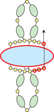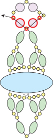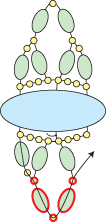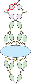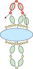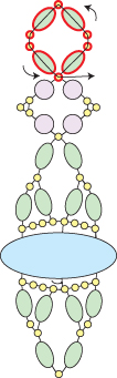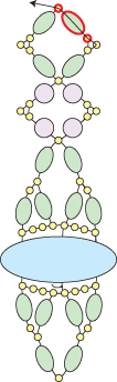 Step 10: Go across through the bottom three seed beads, up through the right-most hole in the Athos bead and through the seed bead above (all beads highlighted in RED):