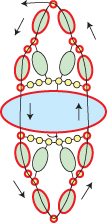 Step 2: Go back across through the bottom four seed beads, up through the right-most hole of the Athos bead and across through the top four seed beads highlighted in RED: