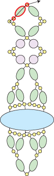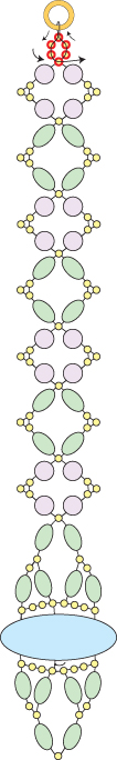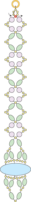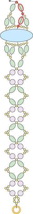 You’ve just finished the center motif. Next you will bead the side straps. Step 16: String a round bead, two seed beads, a round bead, a seed bead, a round bead, two seed beads and a round bead. Go around and back through the seed bead that you just exited (highlighted in RED):