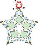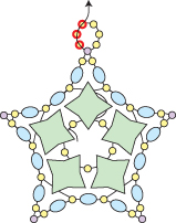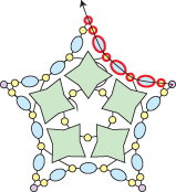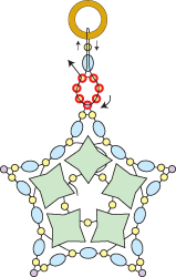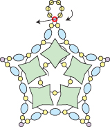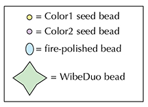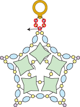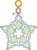 Create some pretty star earrings using size 11/0 seed beads, 3mm fire-polished beads and Czech WibeDuo beads—8mm star-shaped beads with two parallel holes, a “pillowed” front side and a flat back side. Links to exact beads used at the end of the page. MATERIALS: Step 1: Thread your needle with about a yard of FireLine or Toho One-G. Leaving about a six-inch tail that you can weave in and cut at any time, string a Color1 seed bead, a WibeDuo bead, a Color1 seed bead, a WibeDuo bead, a Color1 seed bead, a WibeDuo bead, a Color1 seed bead and a WibeDuo bead. Bring the WibeDuo and seed beads into a circle and tie a tight double knot: NOTE: Position the WibeDuo beads the way they appear in my illustrations and make sure that the rounded “front” side is facing you. Step 2: Go back through the seed bead and the inside hole of the WibeDuo bead highlighted in RED: Step 3: Go around and across through the outer hole of the WibeDuo bead that you just exited (highlighted in RED): There really is no way of hiding the thread so just push it to the back of this top WibeDuo bead. Step 4: String a Color1 seed bead, a fire-polished bead and a Color1 seed bead. Go down through the outer hole of the WibeDuo bead below (highlighted in RED): Step 5: String a Color1 seed bead, a fire-polished bead and a Color1 seed bead. Go down through the outer hole of the next WibeDuo bead on the circle (highlighted Step 6: String a Color1 seed bead, a fire-polished bead and a Color1 seed bead. Go up through the outer hole of the next WibeDuo bead on the circle (highlighted Step 7: String a Color1 seed bead, a fire-polished bead and a Color1 seed bead. Go up through the outer hole of the next WibeDuo bead on the circle (highlighted in RED): Step 8: String a Color1 seed bead, a fire-polished bead and a Color1 seed bead. Go across through the outer hole of the last WibeDuo bead on the circle (highlighted in RED): Step 9: Go back around through the outer ring of beads highlighted in RED): Step 10: Go back down through the Color1 seed bead, the fire-polished bead and the Color1 seed bead highlighted in RED: Step 11: String a fire-polished bead, two Color1 seed beads and a fire-polished bead. Go down through the Color1 seed bead, the fire-polished bead and the Color1 seed bead highlighted in RED: Step 12: String a fire-polished bead, two Color1 seed beads and a fire-polished bead. Go across through the Color1 seed bead, the fire-polished bead and the Color1 seed bead highlighted in RED: Step 13: String a fire-polished bead, two Color1 seed beads and a fire-polished bead. Go up through the Color1 seed bead, the fire-polished bead and the Color1 seed bead highlighted in RED: Step 14: String a fire-polished bead, two Color1 seed beads and a fire-polished bead. Go up through the Color1 seed bead, the fire-polished bead and the Color1 seed bead highlighted in RED: Step 15: String a fire-polished bead, two Color1 seed beads and a fire-polished bead. Go down through the Color1 seed bead, the fire-polished bead and the Color1 seed bead highlighted in RED: Step 16: Go back around through the beads highlighted in RED so that you are exiting from the top-right Color1 seed bead: Next you will give your star arms a point. Step 17: String a Color2 seed bead and go down through the beads highlighted in RED. The Color2 seed bead that you just added should sit above and a little between the two Color1 seed beads below so that the trio of seed beads form a nice point as you pull tight: Step 18: String a Color2 seed bead and go down through the beads highlighted in RED. The Color2 seed bead that you just added should sit beside and a little between the two adjacent Color1 seed beads so that the trio of seed beads form a nice point as you pull tight: Step 19: String a Color2 seed bead and go across through the beads highlighted in RED. The Color2 seed bead that you just added should sit below and a little between the two Color1 seed beads above so that the trio of seed beads form a nice point as you pull tight: Step 20: String a Color2 seed bead and go up through the beads highlighted in RED. The Color2 seed bead that you just added should sit below and a little between the two Color1 seed beads above so that the trio of seed beads form a nice point as you pull tight: Step 21: String a Color2 seed bead and go up through the beads highlighted in RED. The Color2 seed bead that you just added should sit beside and a little between the two adjacent Color1 seed beads so that the trio of seed beads form a nice point as you pull tight: In the steps that follow, I have included three different ways to connect your earring motif to your earring finding. Pick the one you like best. Closed Jump Ring Step 22: To add a closed jump ring, string six Color1 seed beads. Go around and back through the Color2 seed bead on the earring that you just exited: Step 23: Go back around through the ring of seed beads highlighted in RED: Step 24: Go back up through the seed beads highlighted in RED: Step 25: String a fire-polished bead and a Color 1 seed bead. Go around through a jump ring and then back down through the Color1 seed bead and fire-polished bead that you just added. Continue around through the ring of seed beads below (highlighted in RED): Step 26: Go back around through the beads highlighted in RED and your jump ring: Weave back around through the outer edge of beads along the earring motif again, knot and cut your thread. Connect your earring to your earring finding. Open Jump Ring I love the way Linda Genaw of Linda’s Crafty Inspirations attaches her earring findings and this is a variation of her method. Step 22: String two Color1 seed beads, an 8/0 seed bead and two more Color1 seed beads. Go around and back across through the top Color2 seed bead on the motif (highlighted in RED): Step 23: Go back around through the beads that you just added (highlighted in RED): Weave back around through the outer edge of beads along the earring motif again, k